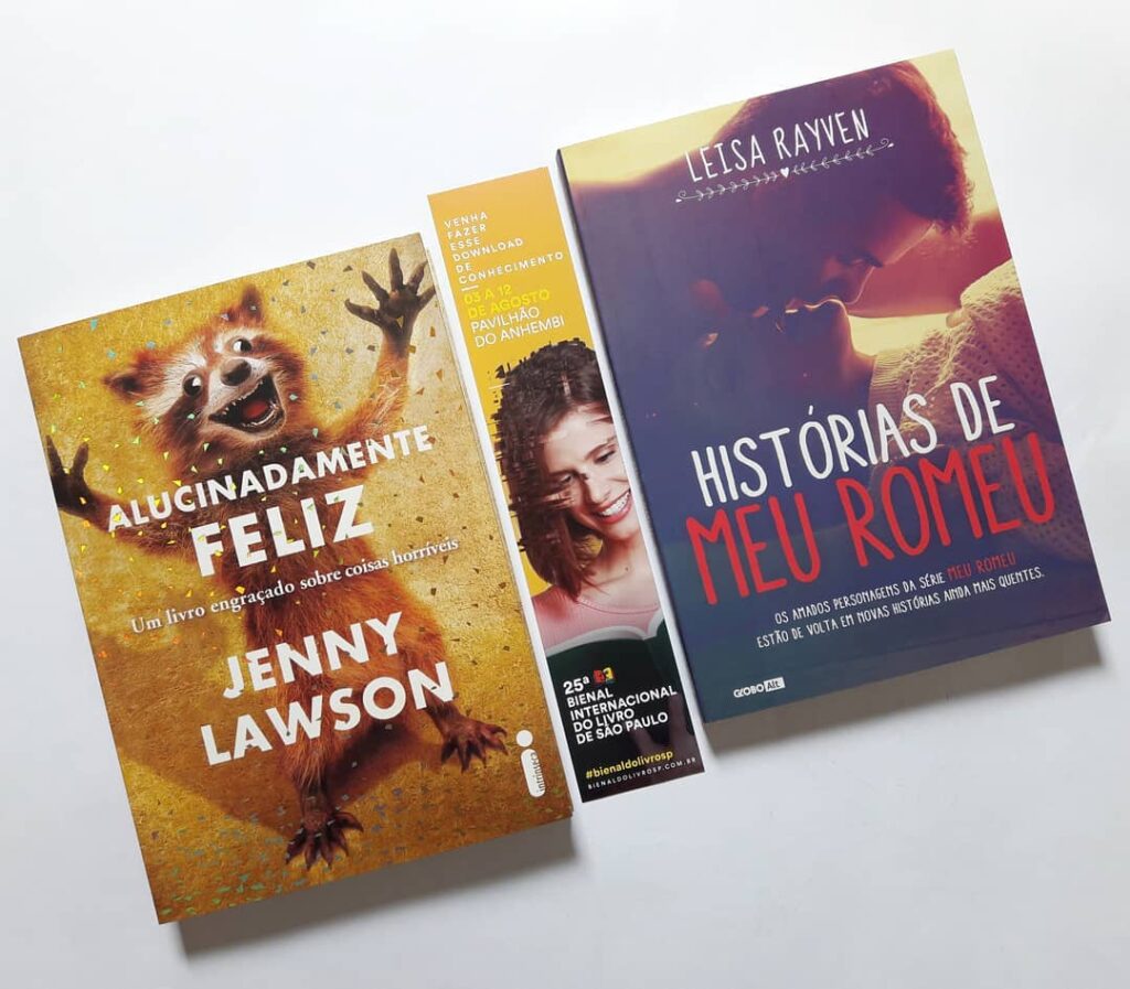 Esse ano fui pela primeira vez para a bienal do livro em São Paulo! Fui no último sábado e estava muito lotado, filas para entrar nos stands, filas para tirar fotos e também não vi muitas promoções dos livros. Por isso acabei não comprando muitos livros (contra minha vontade porque queria comprar tudo). No final, tirei muitas fotos e comprei esse dois livros: ‘Alucinadamente Feliz’ da Jenny Lawson, e ‘Histórias de Meu Romeu’ da Leisa Rayven.